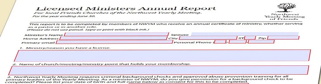 If you have been requested to fill out one of our annual reports you can find that form on this page. Please select the form you are responsible for. The forms are fillable pdf documents. You can download and fill out the forms and return them via email. You can also print them, hand-write the answers and send them through the mail. Thank you for taking the time to complete each form. These forms are used for a variety of purposes at the yearly meeting level. We expect each form to be completed to the best of your church’s ability.